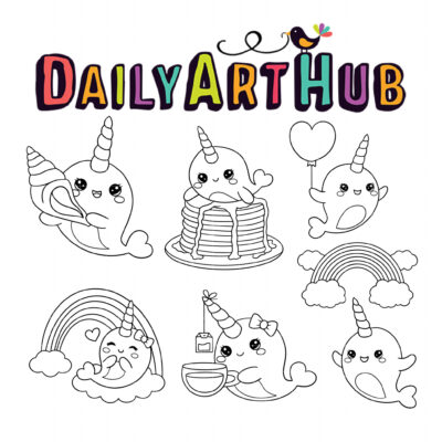 Kawaii Narwhal Outline Drawing Clip Art Set
