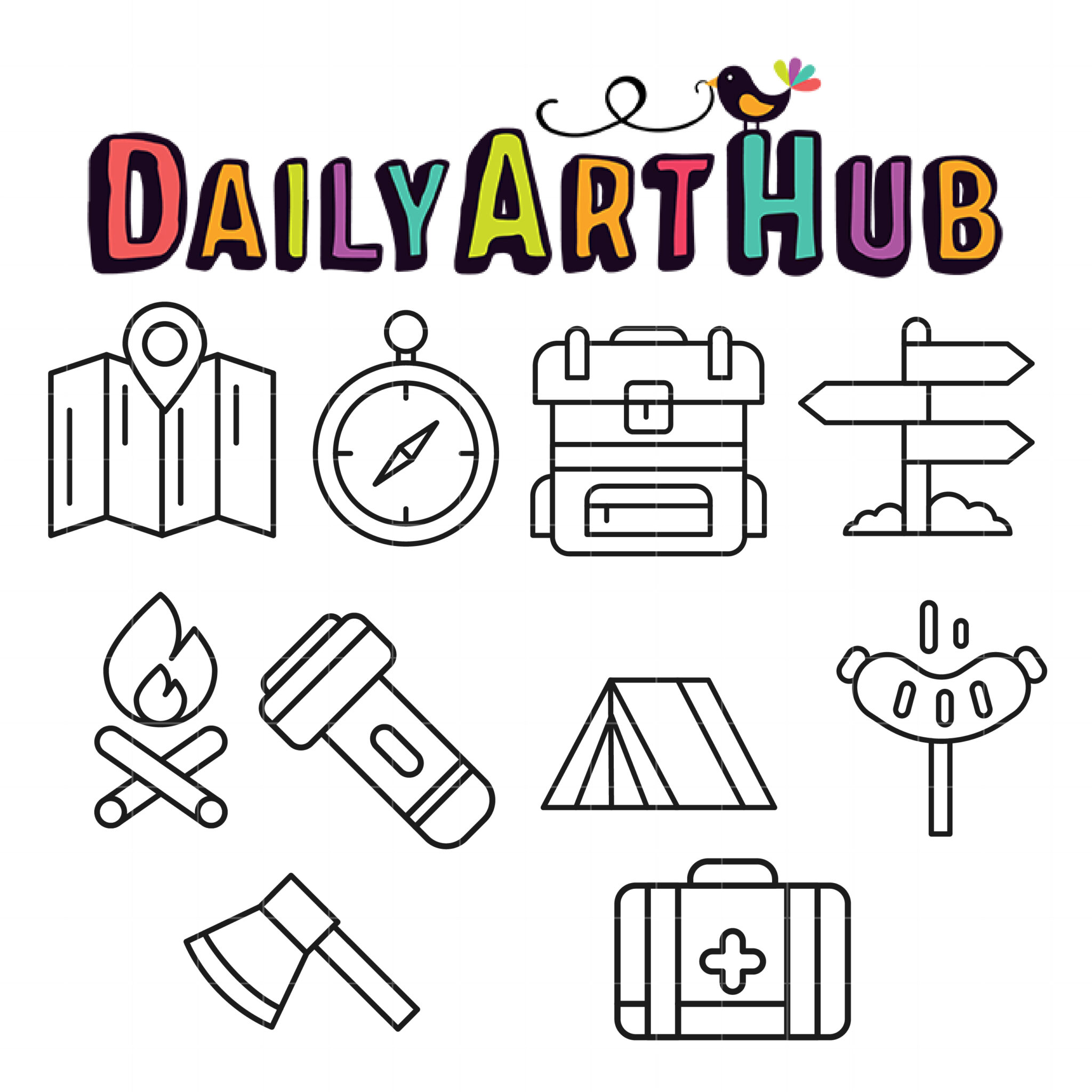 Camping Scout Outline Drawing Clip Art Set
